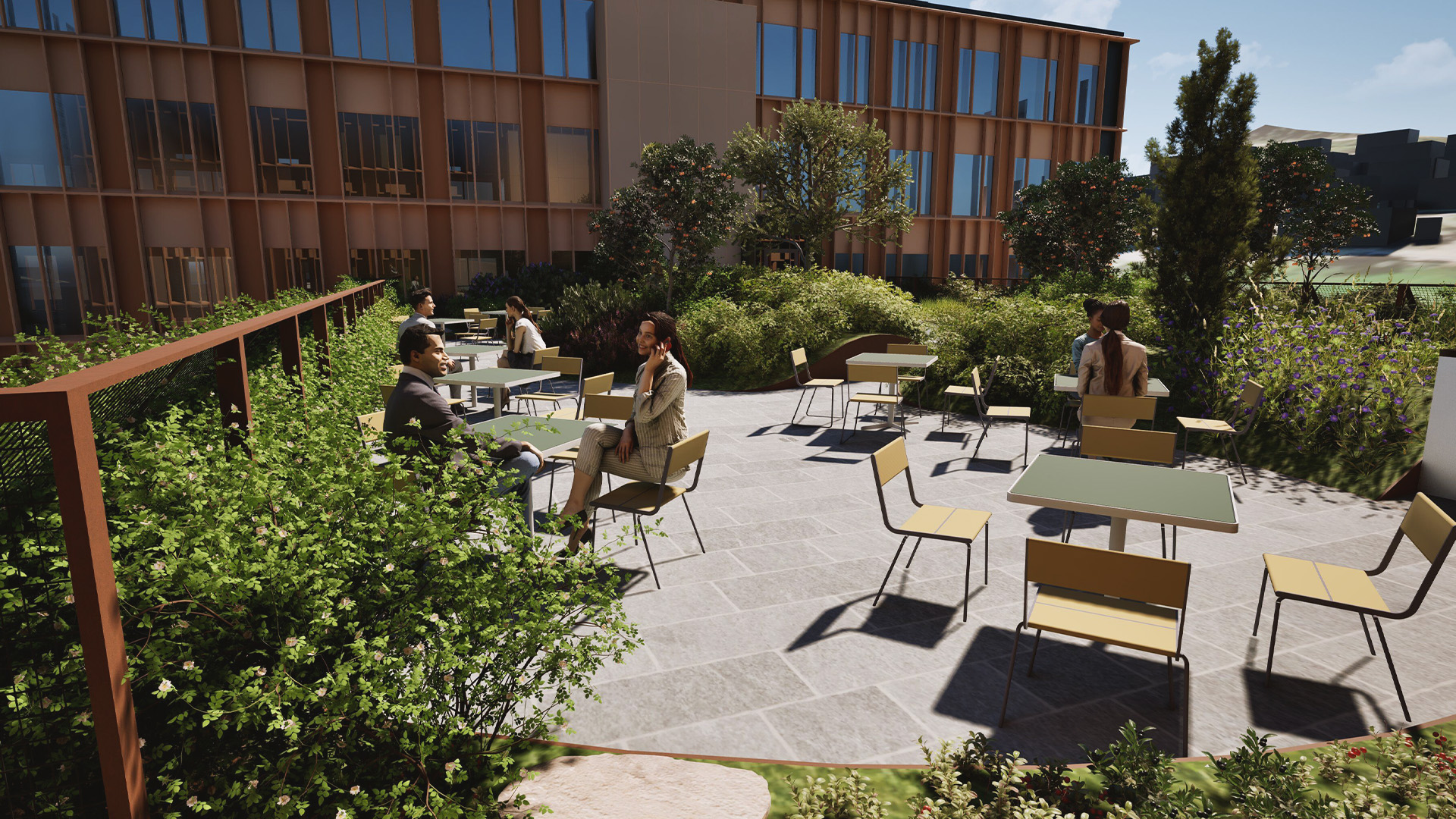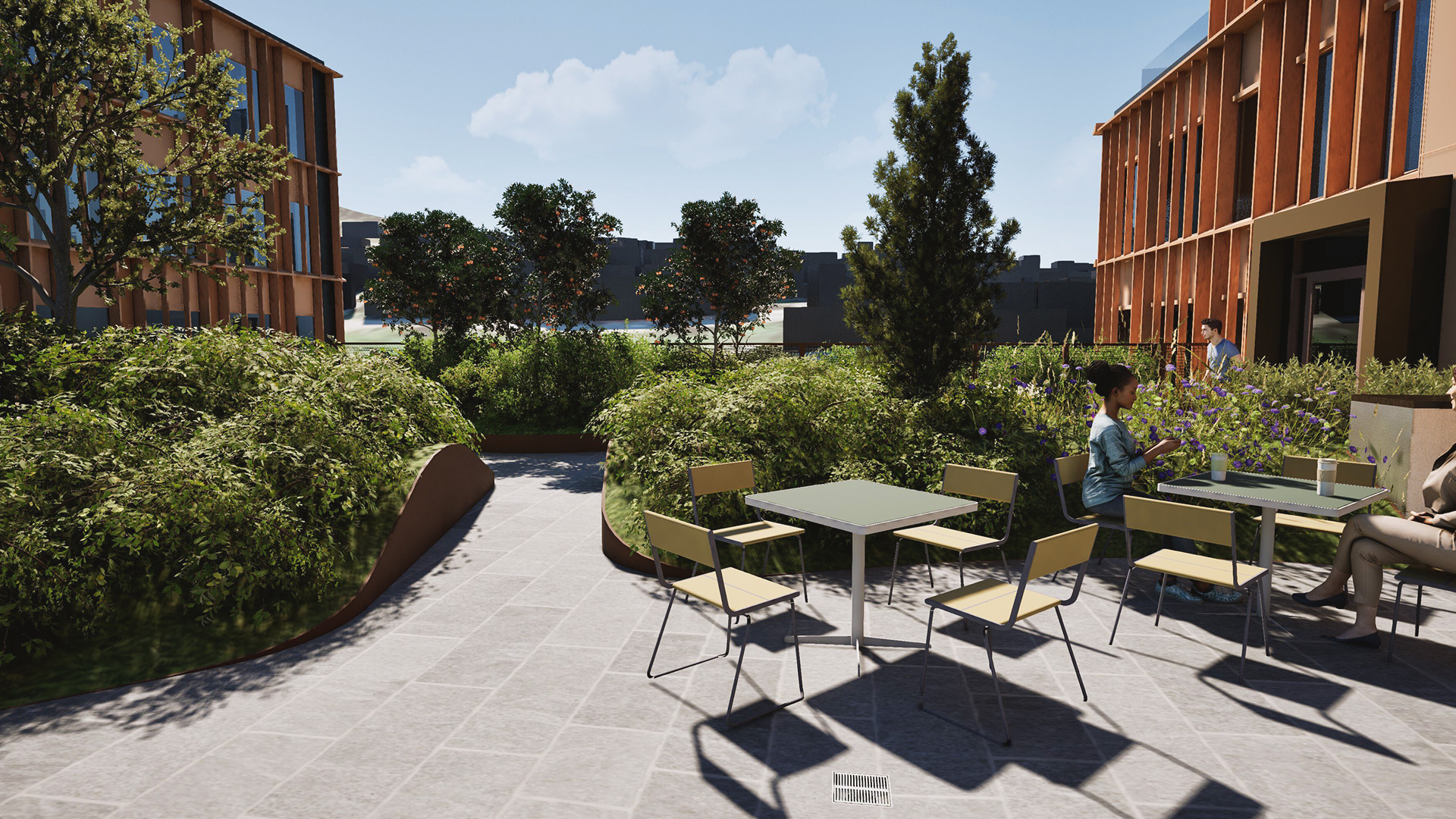 På takflaten mellom de 2 tårnene har vi planlagt en naturhage med stor grad av stedegen vegetasjon. Det skal plantes rikelig med frukt og bærbusker. På innsiden av det grønne gjerde mot vest blir det ett eget område for enkel og funksjonell dyrking av grønnsaker, salat og krydder. Mat som skal brukes i byggets kantine.